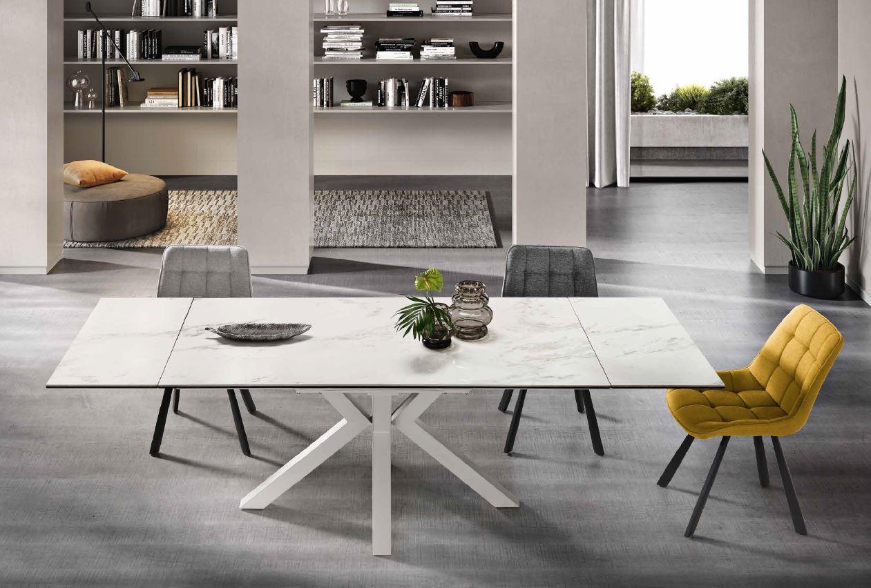 tavolo moderno allungabile base in metallo nera e piano in grès porcellanato effetto marmo bianco lucido chiuso L 160 cm allungabile fino a L 240 cm