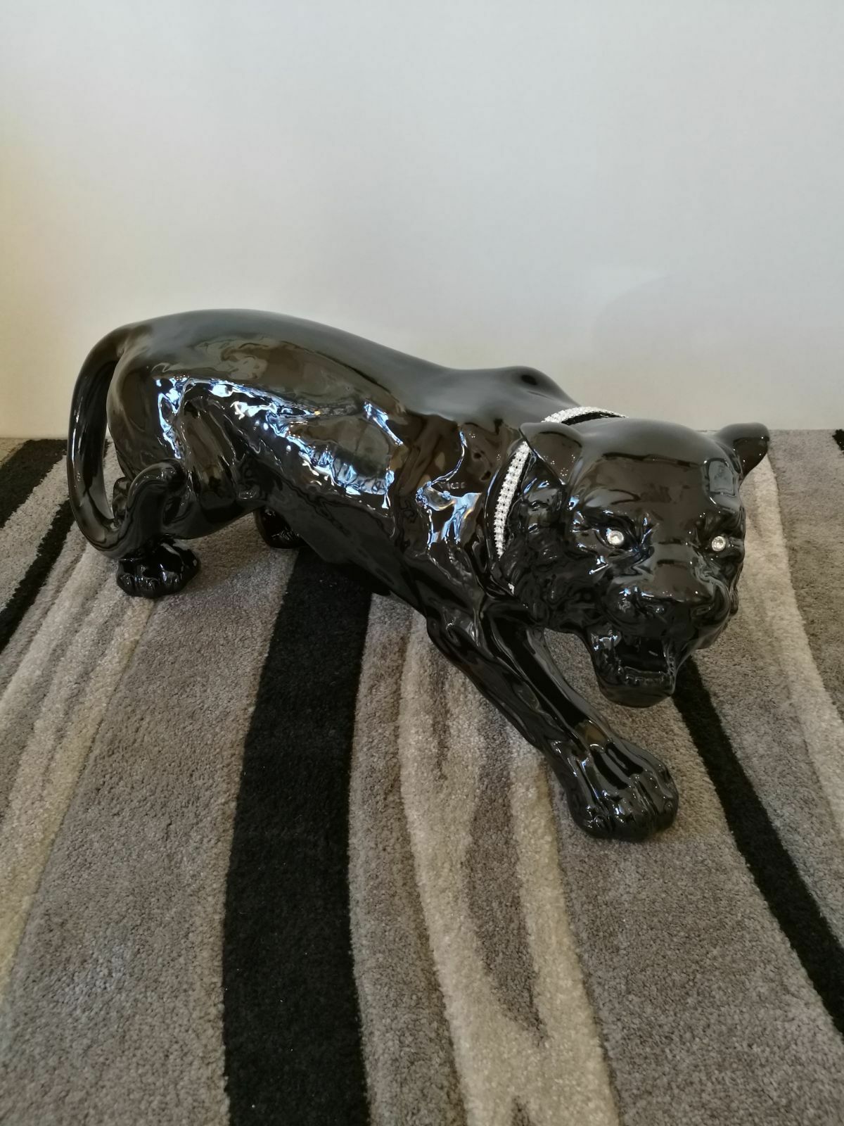 TIGRE IN AGGUATO IN CERAMICA NERA CON COLLARE E OCCHI IN CRISTALLO