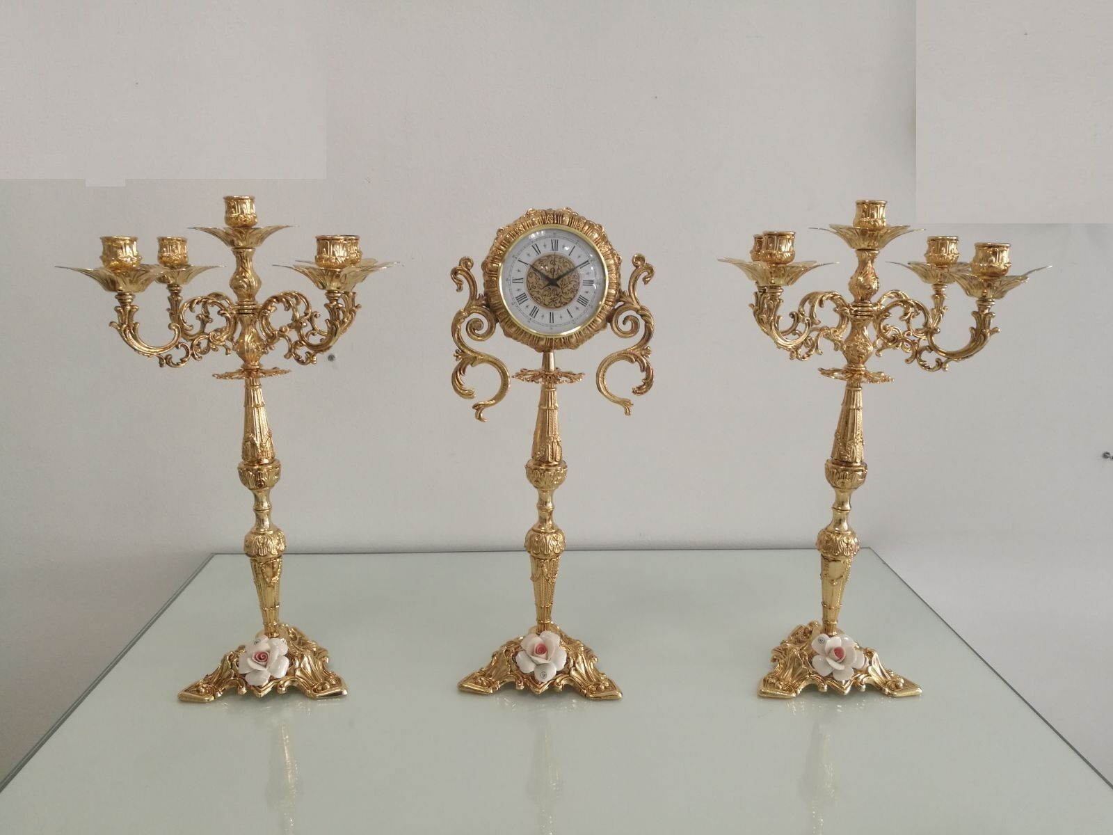 TRIS CANDELIERE E OROLOGIO DA TAVOLO IN METALLO BAGNO ORO CON ROSA CAPO DI MONTE