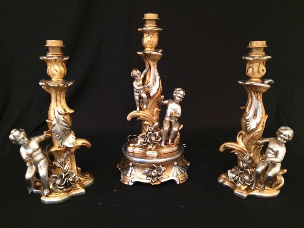 TRIS LUME GRANDE E PICCOLO DX E SX ANGELI E ROSE CERAMICA FOGLIA ORO CRISTALLI