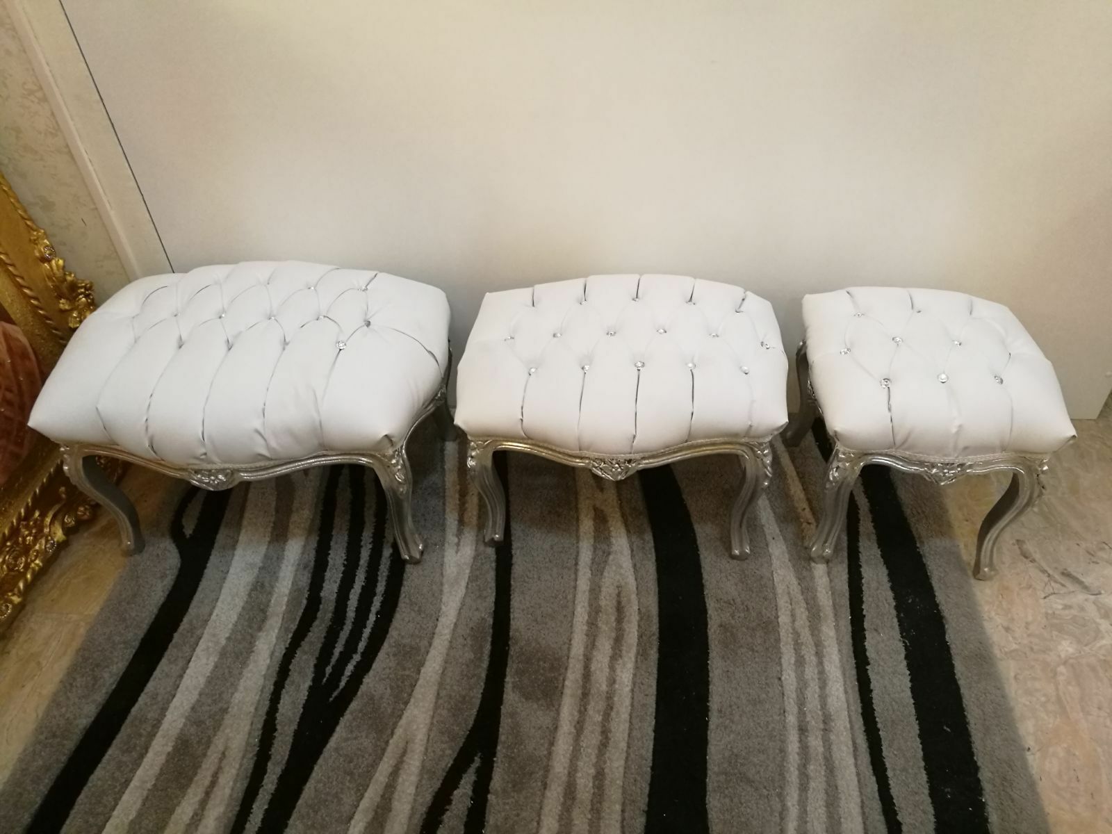 TRIS POUF GRANDE MEDIO E PICCOLO LEGNO FOGLIA ARGENTO ECOPELLE BIANCA CRISTALLI