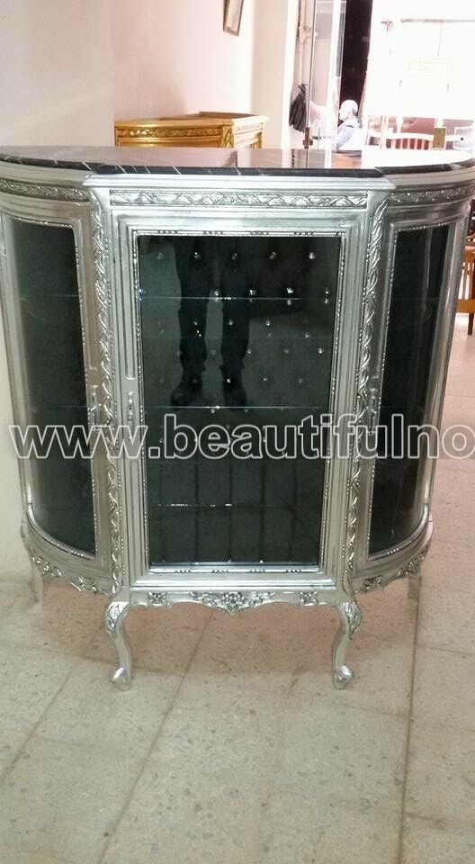 VETRINA BASSA A 3 SPORTELLI IN LEGNO FOGLIA ARGENTO CON MARMO STOFFA NERA