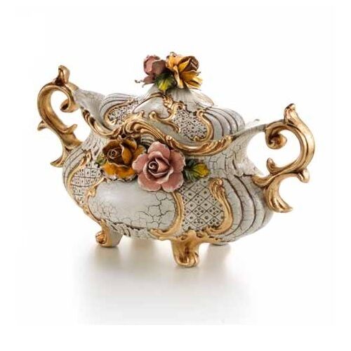 ZUPPIERA JATTA CON COPERCHIO E MANICI CERAMICA FIORI AVORIO DECORI FOGLIA ORO